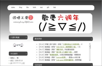 網站因為互動性弱,加上時間有限,更新衰弱相當正常,不過六年下來,累積的文章量也不少,而且同人文、大長篇和生日賀詞文小劇場,我還是都會丟網站,加上雜寫的BLOG越來越亂就會想把內容整理回網站,兩者都是不願意丟失的重要處所,加上雖然很少人但偶爾還是有人來澆水或針對網站更新內容回覆的留言板,三窟還是要努力地維持下去!