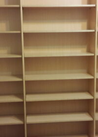 把書櫃上的物品通通拿掉,清空還它光鮮亮麗的一面。拆下來的木板先放一旁,漫畫堆在地板上。書櫃是可拆式,能夠調整每格大小,因為木板上有旋轉鈕。